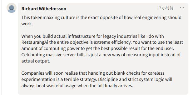 这种文化在观察者眼中已经偏离了工程应有的轨道。有网友评论称,真正的工程追求效率,用最少的资源换取最优的结果。而当前这种攀比服务器账单的行为,不过是将烧钱误当作生产力,企业若为草率的实验无节制地买单,终究会为此付出代价。