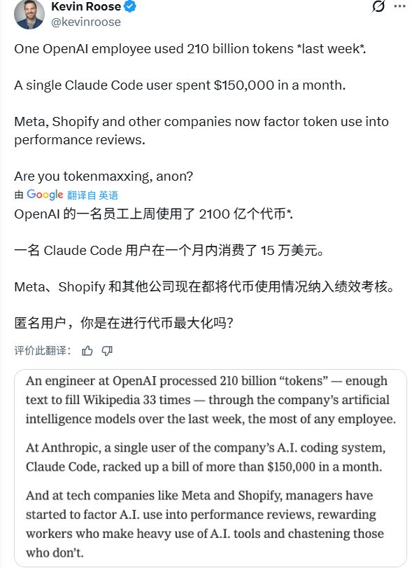 在最近的一周内,有人消耗了超过2100亿个Token,而另一家公司在一个月内为AI编程工具投入了15万美元。