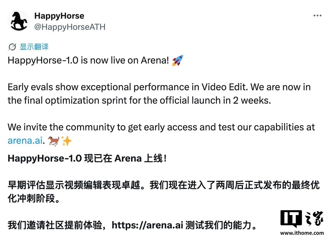 阿里巴巴于今日宣布,其最新研发的人工智能视频模型 HappyHorse-1.0 已在 Arena 平台上开始公开测试。