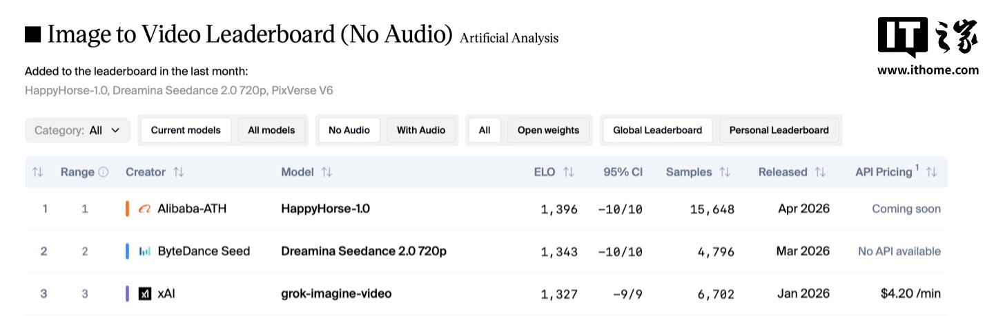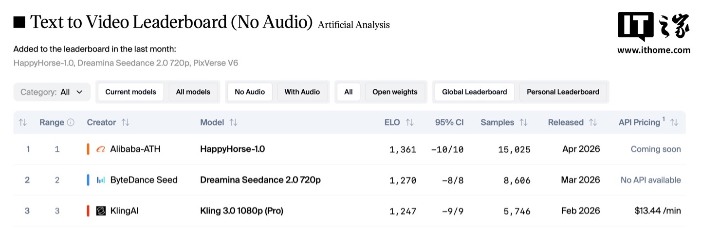 相关数据显示,HappyHorse-1.0 已经超越了字节跳动的 Seedance 和快手的可灵等竞争对手,在 Artificial Analysis 的 AI Video Arena 排行榜上占据首位。