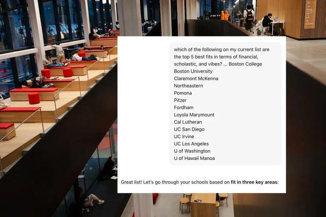 根据咨询机构Ruffalo Noel Levitz 2024年的调查,三分之一的高中生在使用AI规划大学申请。他们让AI拉出一长串学校清单,并把学费、奖学金和录取率整理成表格来进行初筛,但他们不会完全依赖AI做决定。