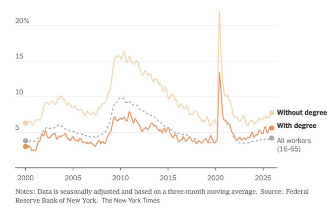 “失业潮”与AI崛起的周期恰好重叠在一起|图源:《纽约时报》