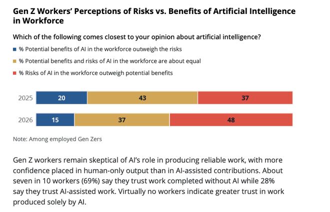 根据盖洛普的数据,已经就业的Z世代中有48%的人认为,在工作场所中AI带来的风险远大于收益,这一比例在过去一年内大幅上升了11个百分点。而认为AI利大于弊的比例仅为15%。