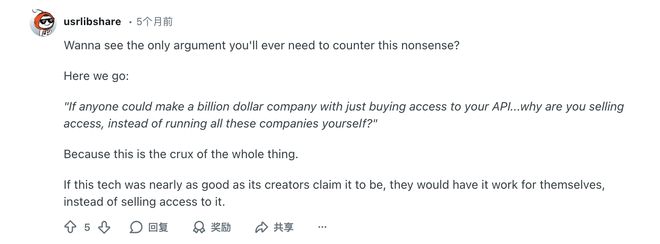 更多人附和了这种底层商业逻辑:如果随便哪个路人买个API接口就能缔造十亿美元的商业神话,那巨头们为什么不自己去闷声发大财,反而要苦哈哈地赚你的几块钱接口费呢?