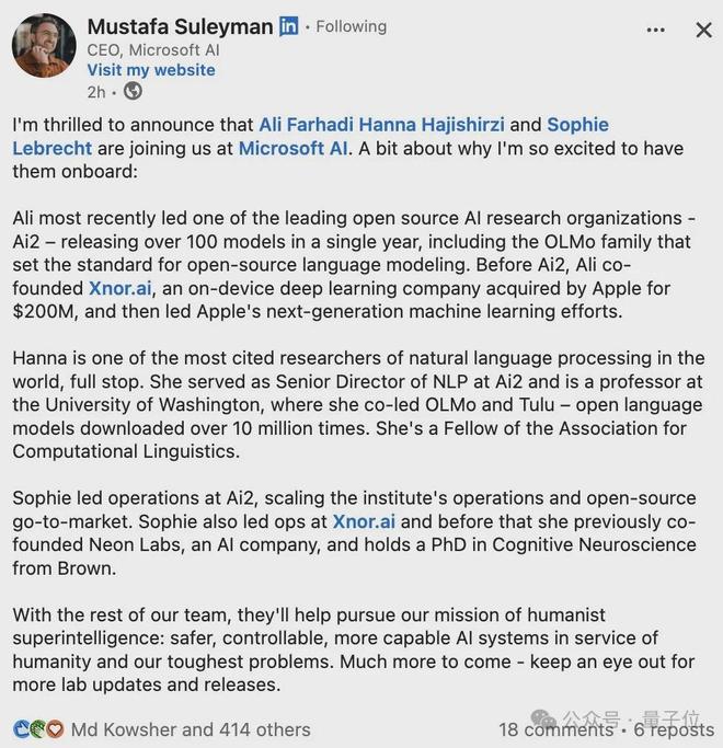 Ai2前CEO阿里·法哈迪、前首席运营官索菲·莱布雷希特、汉娜·哈吉希尔齐和兰杰·克里希纳,统统被苏莱曼打包进了微软。