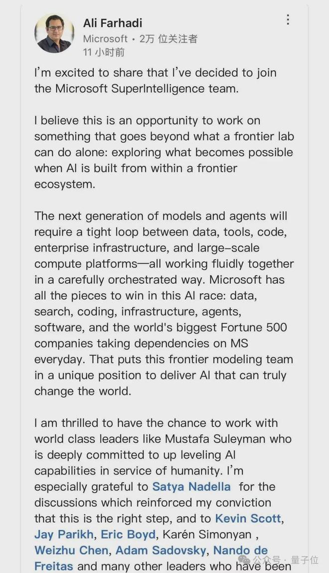 从去年11月起,苏莱曼就开始组建超级智能团队,目前已从谷歌、Meta、OpenAI、Anthropic等巨头挖角了不少研究人员,还在不断从Ai2和华盛顿大学聘请人才。