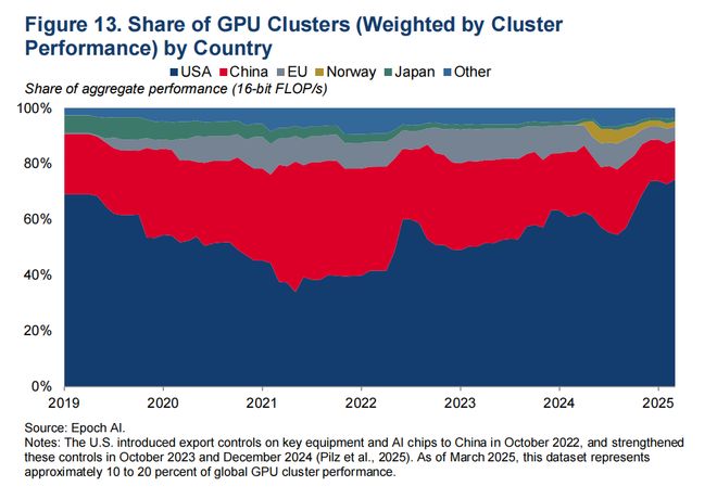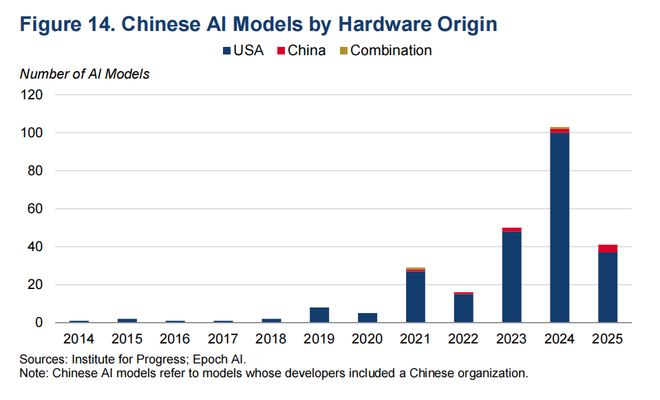 由于大量投资,截至2025年5月,美国拥有全球约74%的人工智能算力(见图13),而且许多外国人工智能硬件最初由美国公司制造。例如,几乎所有中国人工智能模型都在美国硬件上训练(见图14)。