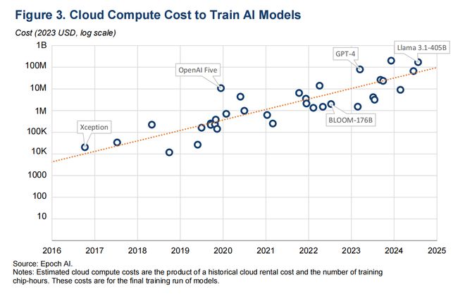 图3 训练不同AI模型的云计算成本,单位:2023年美元