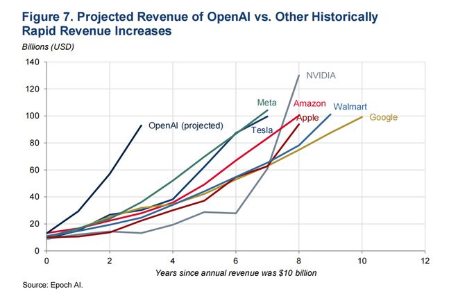 图7 OpenAI预计收入相较于其他企业的历史性收入快速增加,单位:10亿美元;横轴:距离年度收入达到100亿美元的年数