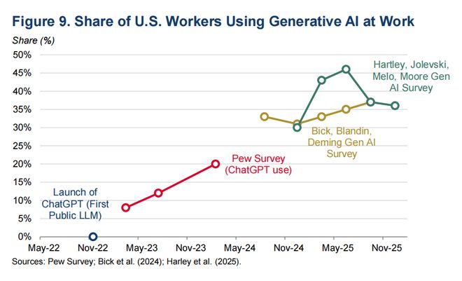 购买人工智能付费订阅服务的企业比例增长更快,从2023年1月的7%升至目前的45%。美国劳动者的情况类似,目前约有40%的人在工作中使用生成式人工智能(见图9)。