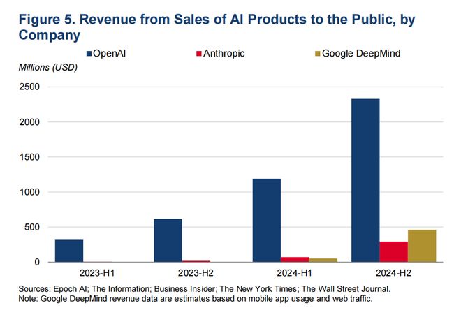 图5 各公司面向公众的AI产品销售利润,OpenAI(蓝)、Anthropic(红)、谷歌DeepMind(黄),单位:百万美元