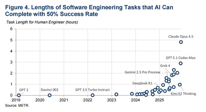 图4 不同AI历年来能以50%成功率完成的软件工程任务长度,单位:对人类工程师而言的任务长度(小时)
