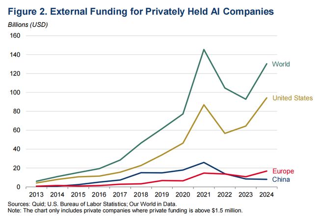 满足这些需求需要巨额投资。2024年,全球企业界对人工智能投资达到2520亿美元。仅生成式人工智能就同比增长19%,达到340亿美元。这些投资集中在美国,2024年美国私营部门人工智能投资为940亿美元(见图2)。