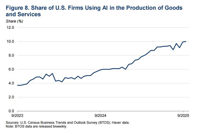 各类组织对人工智能的使用率从2023年的55%跃升至2024年的78%。特别是,在商品和服务生产中使用人工智能的企业比例,从2023年的不足4%增至2025年9月的约10%(见图8)。