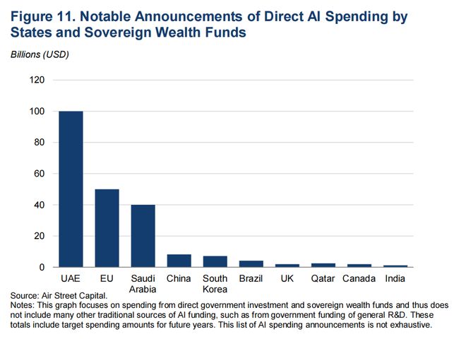 图11 各国及主权财富基金关于直接AI投入的重要声明,单位:10亿美元