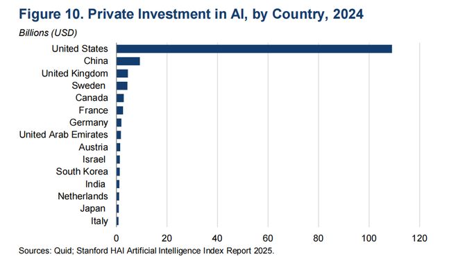 图10 2024年各国对AI私营领域投资,单位:10亿美元