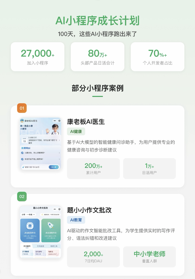 AI小程序成长计划自今年一月启动以来,已取得显著进展。短短一百天内已经有超过27000个AI小程序加入,日均新增数超过了270个,从三月份起更是加速至每日新增380多个。其中个人开发者占据了大部分比例,验证了“一个人可以使用AI创建一个小程序”的可能性。