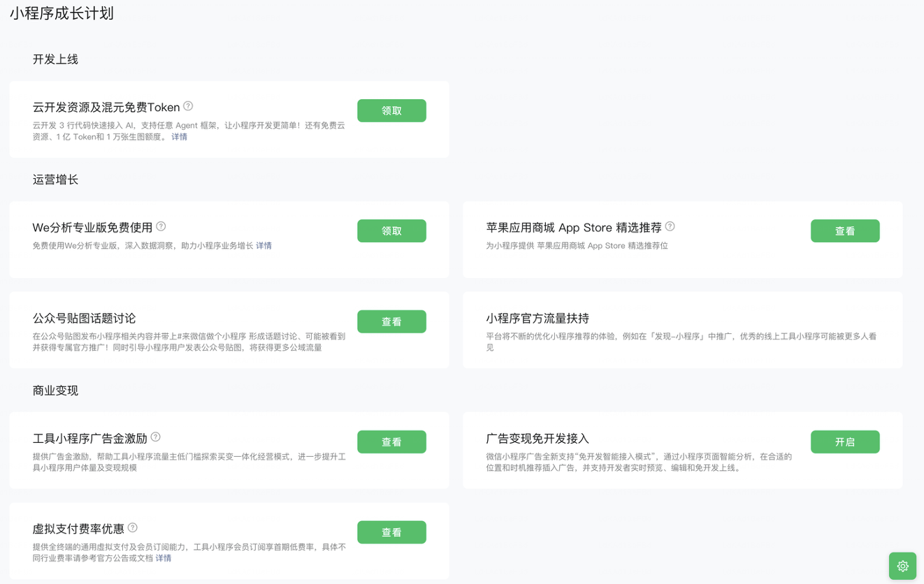这次更新的核心变化在于向所有类型的小程序开放申请资格。所有的开发人员都可以申请包含免费云开发环境、一亿大模型Token、无门槛广告接入以及优惠虚拟支付费率在内的“AI大礼包”。