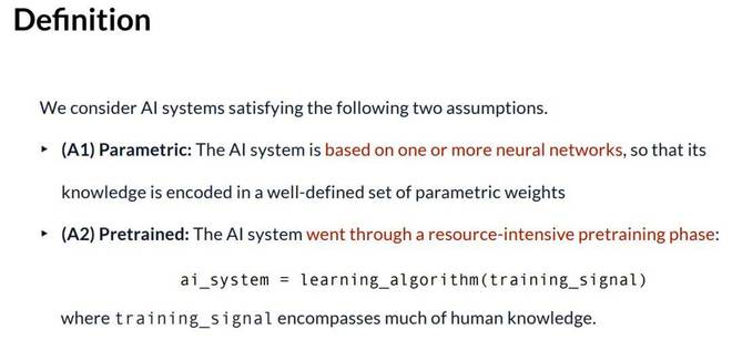 第一个假设是参数化的,即 AI 系统基于一个或多个神经网络,知识被存储在一组明确定义的参数权重中;第二个假设是 AI 系统必须经过预训练。AI 系统经历了一个资源密集型的预训练阶段,在这个阶段中,它接收包含大部分或全部人类知识的训练信号,并将其转化为参数权重。