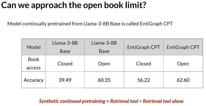 对于实体图方法,在闭卷情况下,我们的准确率大约是 56%,虽然这并没有完全填补与开卷测试的差距,但我们发现,如果你将开卷方法和持续预训练结合起来,实际上能得到最好的结果。这意味着它们的改进是互补的。