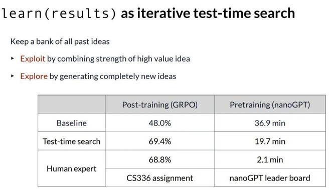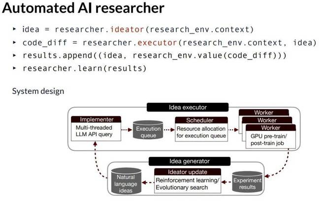 想象一下,这个「学习 API」有点像是在更新研究员的一些内在特质。对于这个「学习 API」或构思器的更新,可以采用强化学习的方法,这意味着将修改研究员内部神经网络的参数权重;它也可以像是一个演化搜索过程,维护一个类似实验结果清单的库。在本次演讲的范畴内,我将只聚焦于演化搜索的部分。