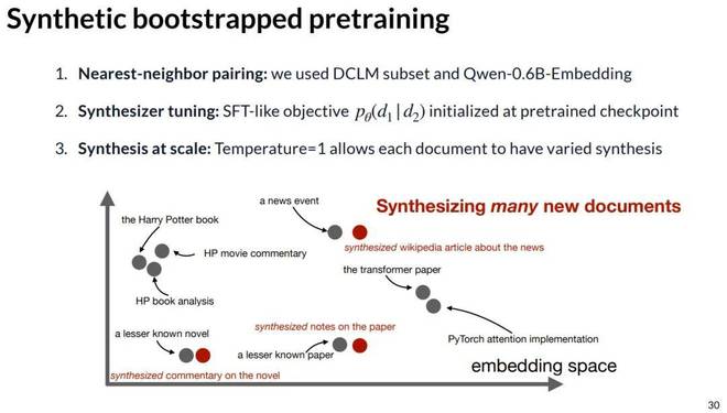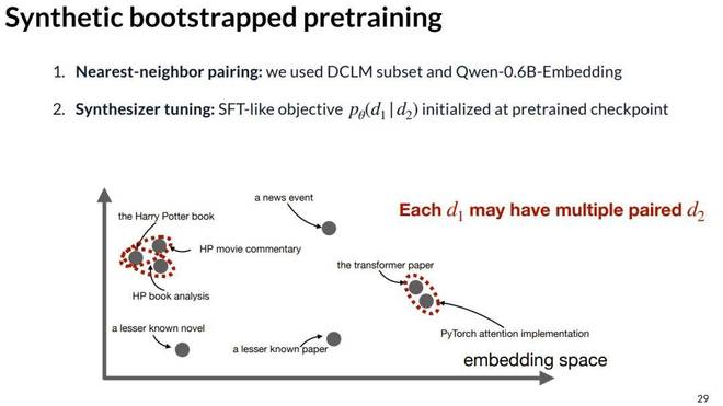 而右侧的合成文档,内容开始像是在讲述一趟圣地亚哥之旅,然后它开始把焦点转向浓缩咖啡机,而浓缩咖啡机并非源文档关注的内容。也就是说,模型完全自主地想出了这个主意,这也展示了合成内容的多样性。我们还有另一篇不同的合成文章,试图将圣地亚哥的咖啡馆与纽约进行对比,而「纽约」这个词根本没有在真实文档中出现过。这就是为了让大家体会一下这种生成过程会呈现出什么样的感觉。在我们准备好所有这些真实数据和合成数据之后,我们将用它们混合在一起来进行训练。