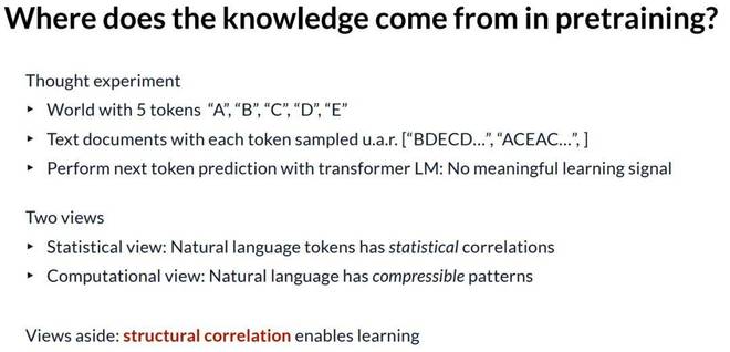 另一种更偏向计算层面的观点,即更接近香农最初提出的理论是,自然语言文本具有允许其被压缩的模式,而下一个 token 预测本质上是在进行信源编码以压缩文本。但抛开具体观点不谈,无论是统计学还是计算学的视角, token 之间确实存在使得模型能够学习的结构性相关性。