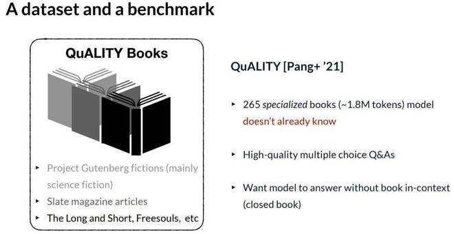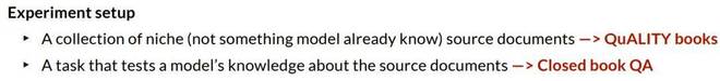 - 第二,我们需要一个任务来测试模型对这些源文档的了解程度,以便我们追踪进展。在本文中,我们使用了该团队构建的 QuALITY 数据集,它同时满足源文档和问答任务这两个标准。