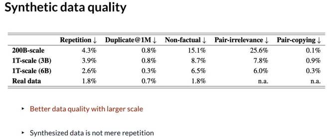 这里我们采用的通用范式是,因为我们试图评估数据集的某项属性,而该数据集非常庞大。因此,我们会对一部分文档进行子采样,然后使用像现成的 GPT 模型那样,编写一些评分标准来检测文档中是否存在重复内容,或者是否包含不符合事实的信息。我们发现,随着模型规模的扩大,生成的数据质量也更好,而且这些合成数据并不仅仅是简单的复述。在表格的各列中,我想重点强调「非事实」这一列,我认为这非常令人兴奋。因为对于合成数据而言,事实性始终是一个难题。在 200B 规模下,我们看到,事实错误率甚至达到了 50%。存在着大量的幻觉。当你把训练计算量增加 5 倍时,非事实的比例显著下降;当你把模型规模增大一半时,这一比例进一步降低。虽然它还没有达到完全比肩真实数据的水平,但我认为这种从 3B 到 6B 的下降非常有趣。因为事实性在某种程度上,取决于模型掌握了多少关于世界的知识。