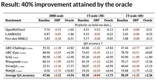 我们看到的关键结论是,如果我们观察问答准确率的平均提升情况,包括 SBPT 和 Oracle 相对于基准的相对提升,在所有这三种情况下,我们都看到了可以由 Oracle 实现的约 30% 的提升,所以这种改进是非常一致的。有趣的是,我们发现在某些基准测试中, 6B 参数、 1 万亿 token 的模型已经几乎像是一个可用的语言模型了,这相当于 Llama 计算量的一半,理应如此,这意味着我们能改进的空间应该更少了。但是,在某些基准测试中,我们实际上在 6B 参数的处理条件下看到了更大的提升。这是因为你的合成数据生成器也变得更强大了。它的幻觉变少了。正是这个观察将我们引向了关于自我改进预训练能力的最后一张结果表。