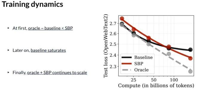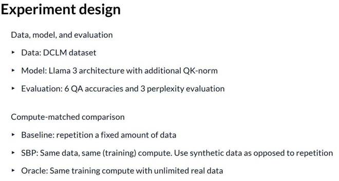 - 其次,我们控制了训练的计算量,以确保整个过程的总训练周期是相同的。我在这里要强调的是,我们并没有控制总的绝对计算量,比如生成合成数据的所有推理成本等。从这个角度来看,合成引导预训练(SBPT)使用了更多的算力,我们仅仅是控制了预训练阶段的计算量。