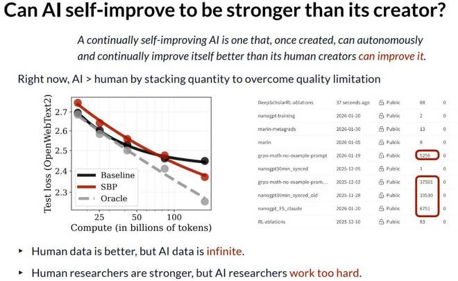 总体而言,演讲的主要结果表明:持续自我改进式的AI确实能够实现比人类创造者更强的能力。这种超越主要体现在数量上的优势上——更庞大的数据集、更复杂的算法和更多的计算量让机器学习模型在某些任务上胜过人类专家。