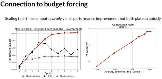 其次,演讲介绍了持续自我改进的算法技术,如预算强制搜索等方法。这些策略能够让AI系统以超乎寻常的方式优化其运行方式和推理过程。