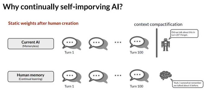 这就解决了我们期望的第一个特性,即我们希望模型在回到人类创造者手中后能够持续获取知识。第二点是,我们希望自我改进模型本身的预训练能力。