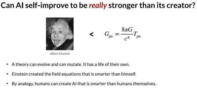 我认为那种认为它不能超越人类的逻辑,源于一种子集逻辑。这就好比:我们人类拥有一组规模为 10 的能力集,而我创造了一个拥有我能力子集的次级存在,所以它永远无法超越我。但是,目前创造 AI 的方式非常具有算法性,比如在海量数据上进行训练。这种过程与爱因斯坦推导并创造出超越自己认知的物理方程的过程极其相似。这种问题一开始就不该被提出。所以我坚信,答案绝对是肯定的