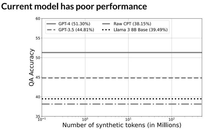 这是四选一的选择题,所以随机瞎蒙的准确率是 25%。我们要微调的模型是 Llama 3 基础模型,它开箱即用的准确率只有 39%。一个顺理成章的做法是直接在原始数据本身上进行微调。我们称之为原始的持续预训练,我们发现准确率实际上略有下降。这是因为 token 的数量实在太少了,除非你进行合理数量的回放(replay),否则你的 batch 设置和学习率规划都没有被正确设定。此外,我们还有两个来自闭源模型的静态参考, GPT-3.5 和 GPT-4,我们看到它们的准确率分别在 44% 和 45% 左右,所以这是一个模型拥有一定相关知识的基准测试,它不是完全随机的,但也绝对达不到 60% 之类的水平。