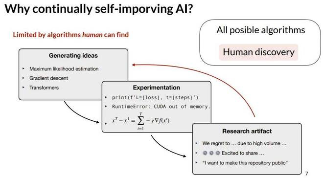 如果我们思考一下人类是如何提出算法的:它经历了一个产生想法的过程(例如最大似然估计),然后进行实验(这可能是编写代码或进行数学推导),最终你得到一些研究成果;随后其他人在此基础上继续研究,这个循环再次开始。这个过程极其依赖人力,并且成本非常高昂。因此,我们发现的仅仅是所有可能算法中的一个子集,而我们希望利用 AI 本身来使这个过程自动化。
