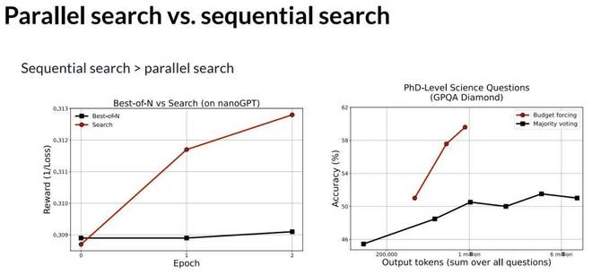 我们观察到了一个非常一致的规律:不管是算法搜索还是写循环让模型强行思考,单纯地扩展测试时计算量都能带来性能提升,但它们都会非常迅速地达到性能瓶颈。另一个观察结果是,无论是在测试时搜索,还是在测试时推理中,都存在一种模式:串行搜索比并行搜索更加强大。