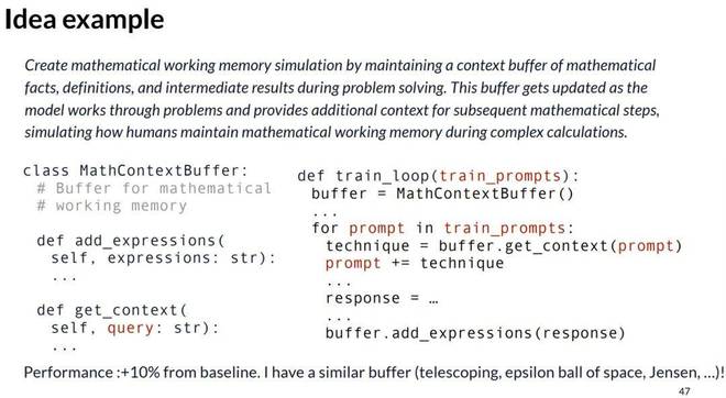 这样一来,在解决数学问题时,这就好比在考试情境中直接给你提示。该方法的性能比基准提升了 10%,虽然不是最好的结果,但我真的非常喜欢它,因为我个人也有一个类似的缓冲区。我实际上有一本手写的笔记本,里面记录了各种数学技巧,比如裂项相消、 epsilon 球空间、琴生不等式以及何时使用它们。所以我非常高兴能看到它提出了与我在做的事情非常类似的方法,而且像 GPT-4 这样的模型竟然能够将其实现出来。