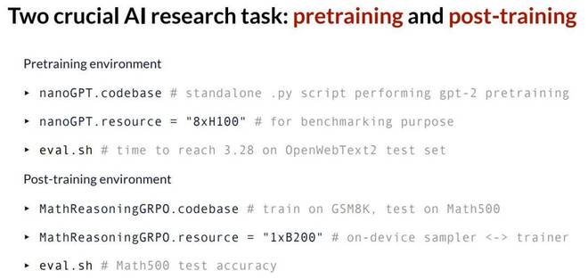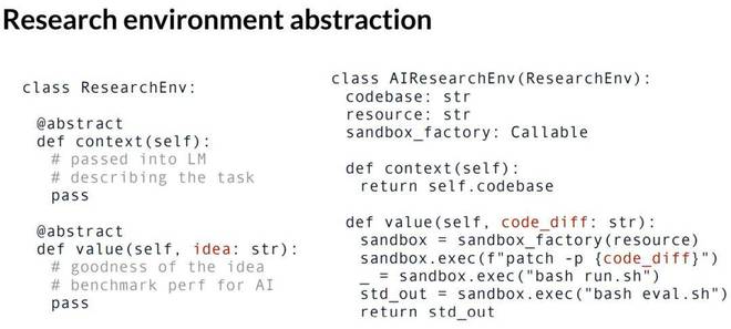 为了使模型能够做到这一点,我将引入「研究环境」的概念。它提供了一个简洁的抽象,告诉你进行 AI 实验需要什么。我们先从一个更通用的研究环境开始。