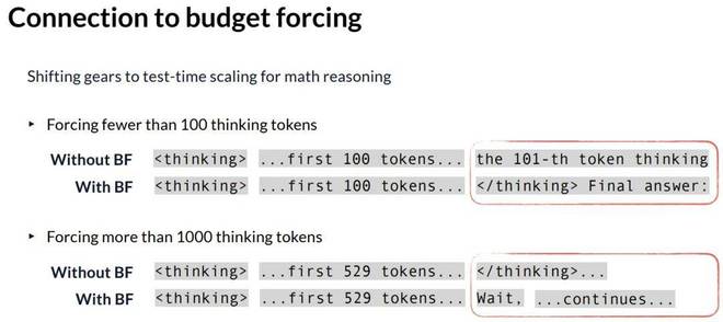 在数学推理中,这里的关键点在于如何强迫模型思考比常规 token 数量更长的时间。假设你想强制模型思考超过 10,000 个 token,如果不采用预算强制技术,模型会先生成一个开始思考的 token,接着生成最初的 500 个 token,然后就会生成一个结束思考的 token。但是有了这项预算强制技术,你可以去掉那个结束思考的 token,并强行追加一个逗号,然后模型就会继续思考下去。