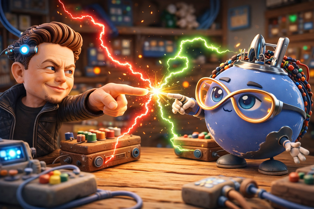 配图一张自己AI手搓的马斯克VS球球,文案就是“脑机接口,你用不用?用就开源地用。”