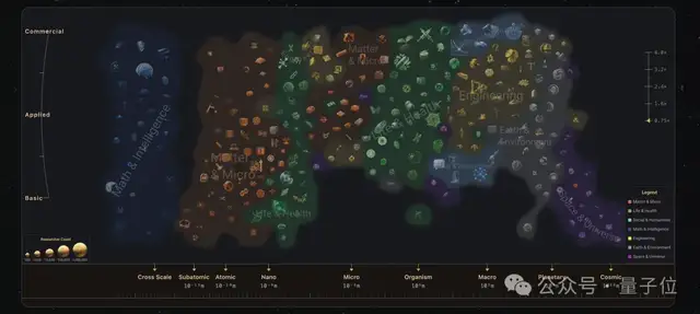 其中,图标越大,就代表相关研究越多,且大多都集中在Nano(纳米)、Micro(微观)、Organism(生物个体)尺度上,而这些恰恰正是人类感知集中的范畴。