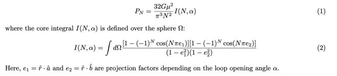 具体来说,有一个核心积分I(N, α),描述了宇宙弦环第N谐波发出的辐射强度。
