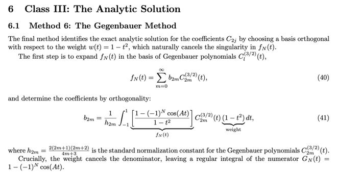 AI发现了一个绝妙的思路:选择Gegenbauer多项式作为展开基底,而这类多项式的正交权函数恰好是(1-t²),正好与被积函数分母中的奇异因子完全抵消!