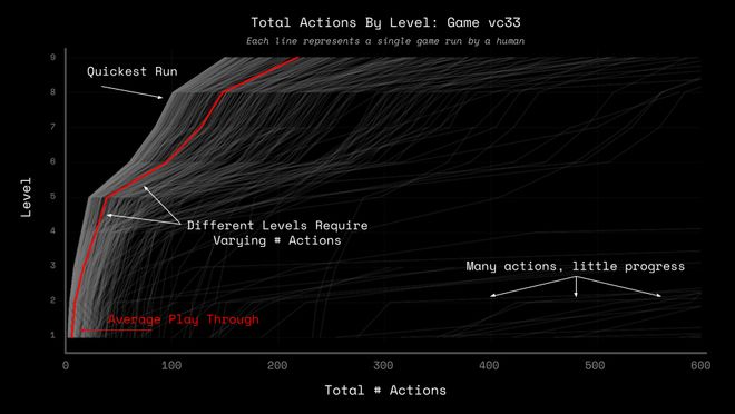 ARC-AGI-3的评分标准不考虑「是否通关」,而是关注「效率」,并且与人类的效率进行比较。