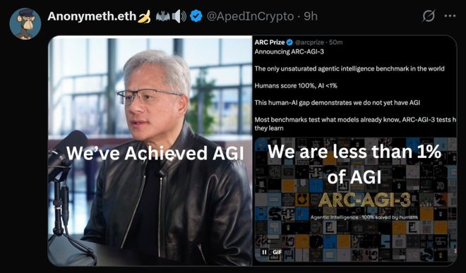 在最近的一次采访中,老黄表示他认为AGI已经实现了。然而,ARC-AGI-3的测试结果表明,目前的人工智能可能连1%的AGI水平都未能达到。