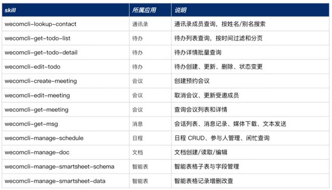 # 查看通讯录品类下的工具 wecom-cli contact # 查看待办品类下的工具 wecom-cli todo # 调用通讯录查询 wecom-cli contact get_userlist ‘{}’三、7大能力都能干什么,官方把常用命令也给全了