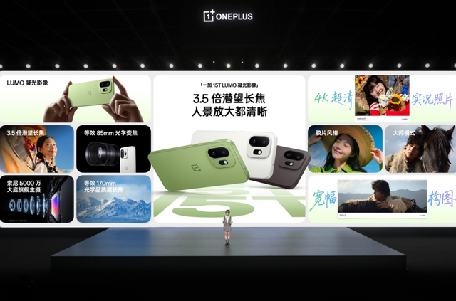 一加 15T 搭载 5000 万像素 3.5 倍潜望长焦镜头和 LUMO 凝光影像系统,拍人拍景都好看。一加 15T 还内置全新 ColorOS 16 系统,带来多项高效的 AI 功能与全新的游戏助手体验。