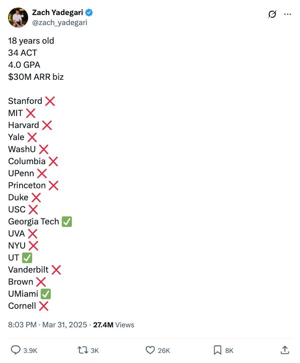 创业故事之外,亚德加里申请大学的经历也让他获得了额外关注。2025年,亚德加里在X平台透露,尽管拥有GPA 4.0、ACT 34分的成绩以及一段成功创业经历,他申请的18所顶尖大学中仍有15所拒绝了他。